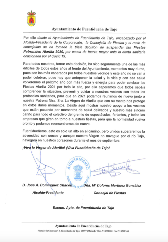 Suspensión Fiestas Patronales Alarilla 2020
